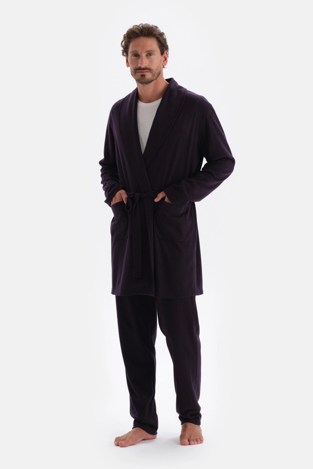 Bordo Çizgi Jakarlı Sabahlık