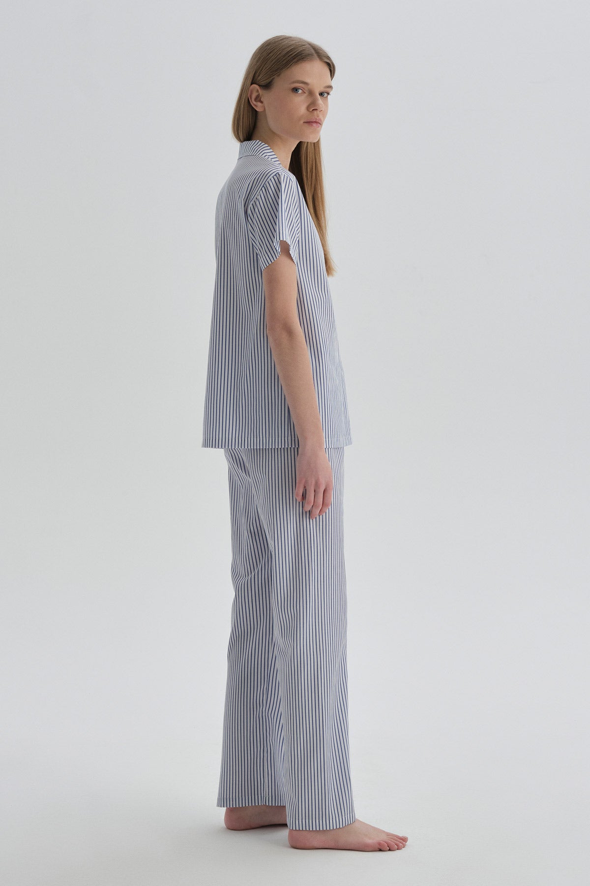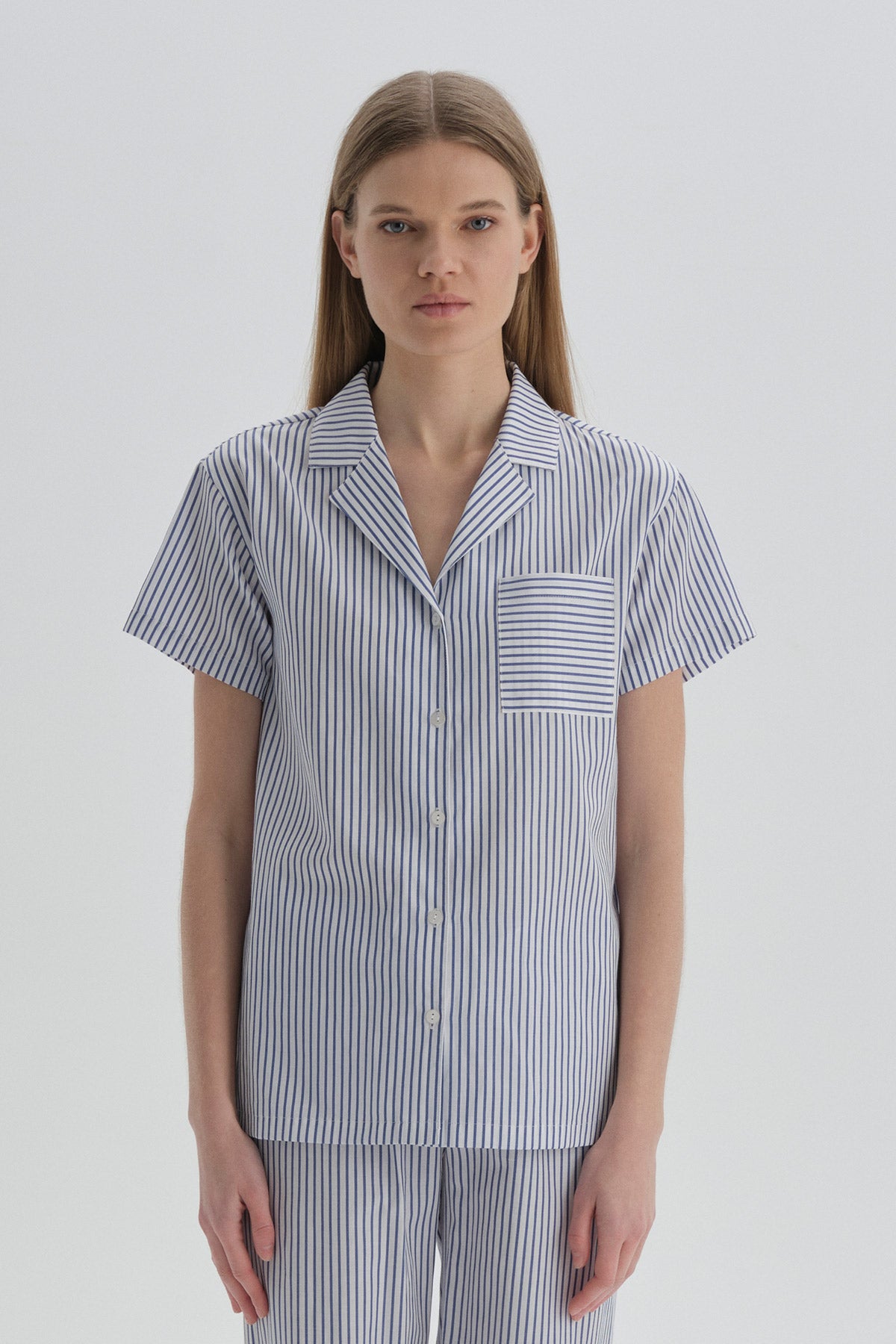 Mavi Ceket Yaka Pamuklu Pijama Üstü