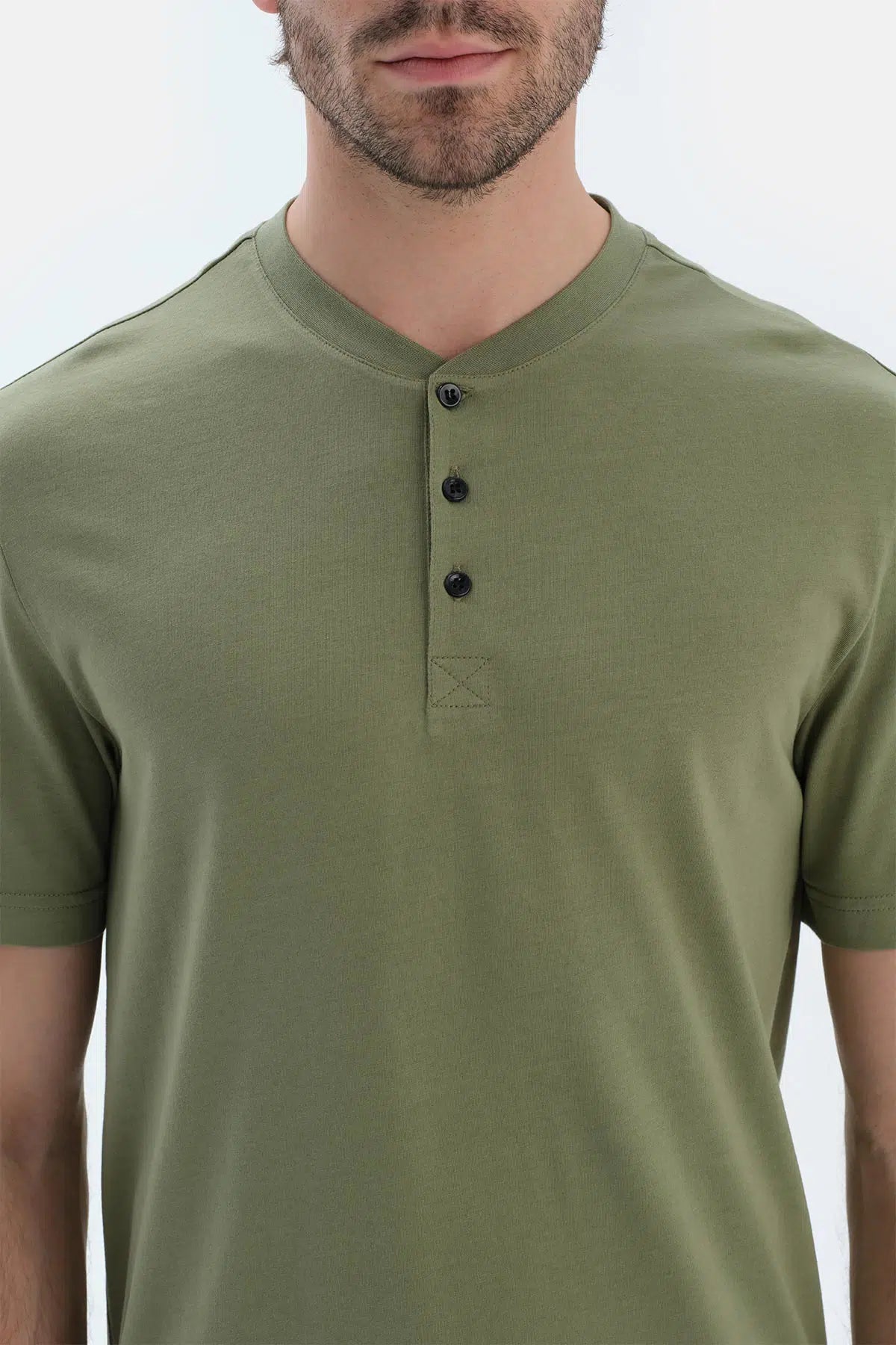 Yağ Yeşili Kısa Kollu Yarım Patlı Tişört Pantolon Pijama Takımı